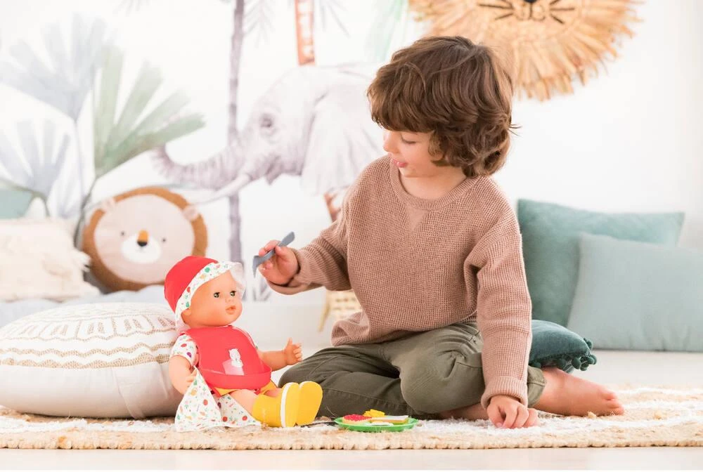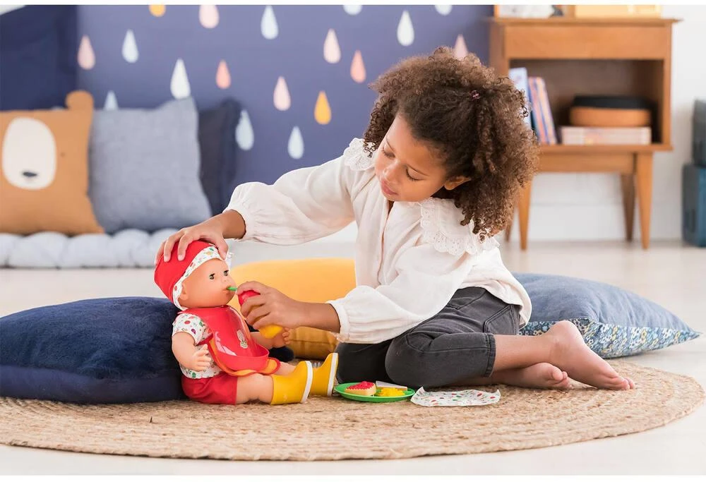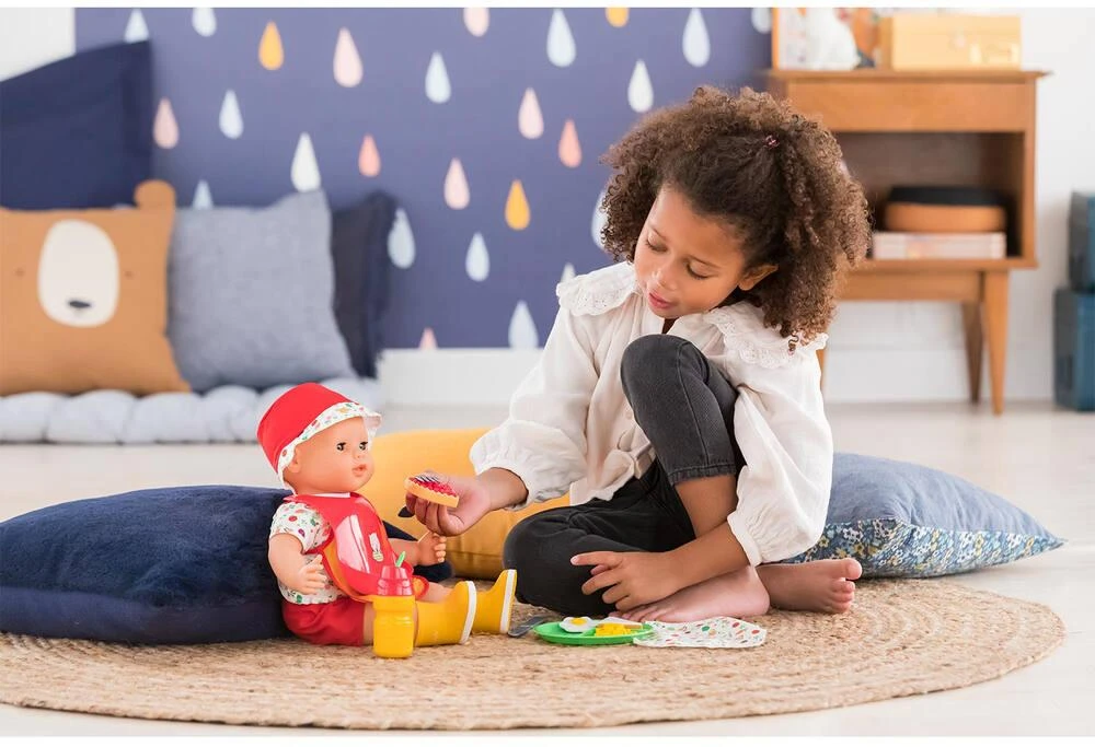 A table ! Le coffret Bon Appétit contient tous les accessoires indispensables pour le repas des grands poupons : une assiette à compartiments; une fourchette; un couteau; une bouteille à remplir et une paille; une serviette en tissu; une portion de frites; un œuf au plat; un sandwich; une part de tarte aux fraises et un bavoir souple.