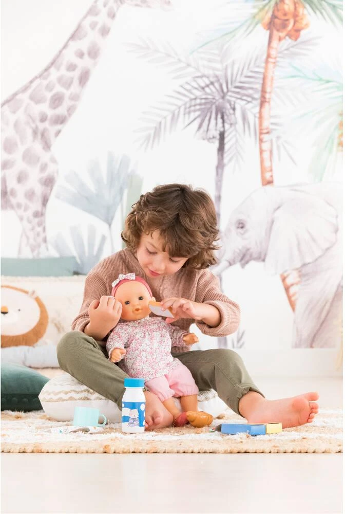 Miam; c’est l’heure du petit déjeuner ! Le Coffret Petit Déjeuner contient tous les accessoires indispensables pour le premier repas de la journée des grands poupons : une tasse; une bouteille de lait (avec bouchon amovible); une cuillère avec de la confiture; un pot de confiture; un croissant (qu’on peut couper en deux); une tartine; une boîte de céréales; une boîte de chocolat en poudre et une serviette en tissu.