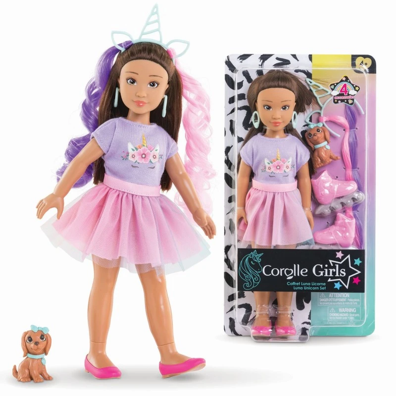 Contenu : une poupĂ©e, une robe, des ballerines, des boucles d’oreilles, un serre-tĂȘte licorne, un chien et des rollers.