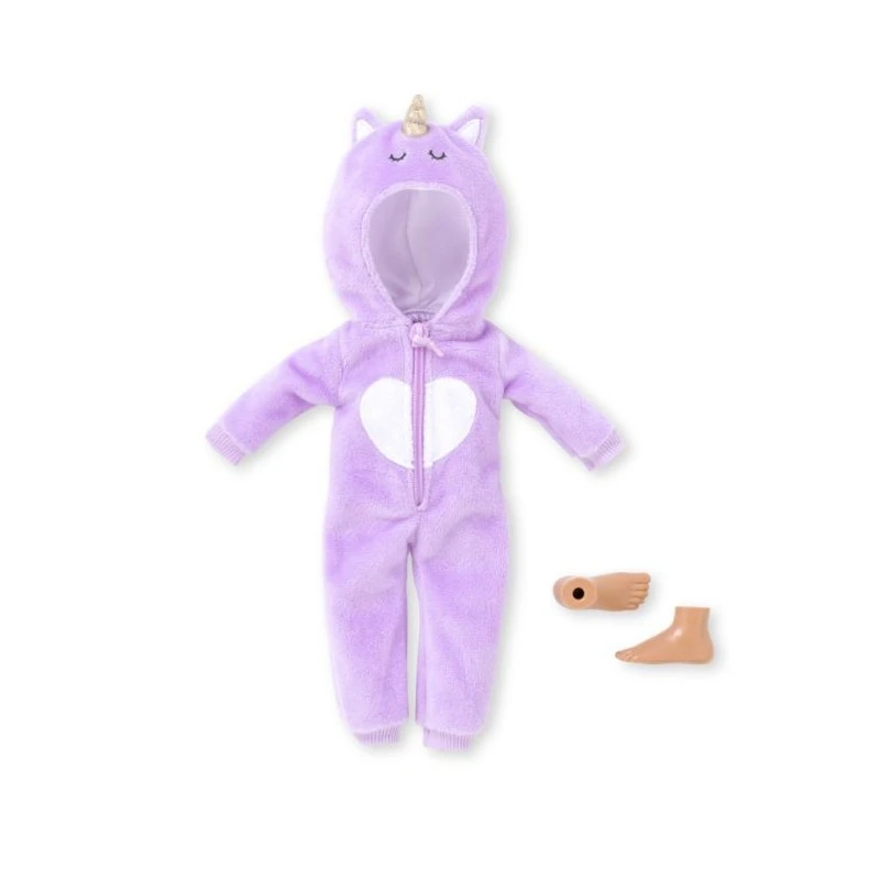 Elle porte une combi-pyjama licorne mauve toute douce.