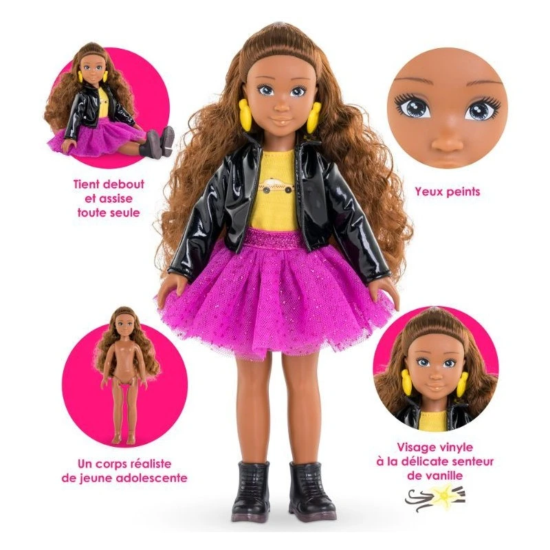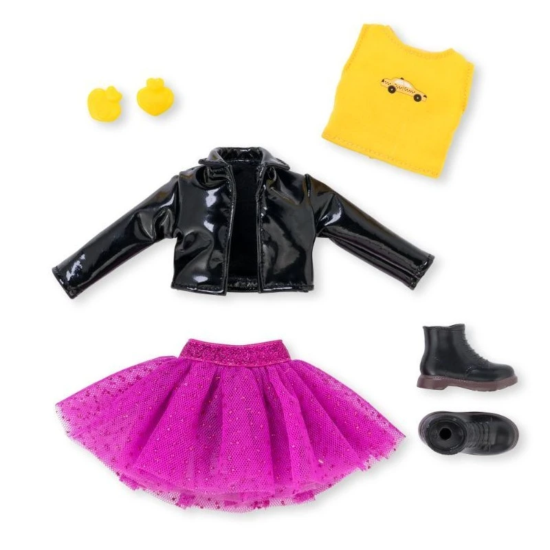 Elle porte 1 jupe en tulle, 1 T-Shirt jaune, 1 veste, 1 paire de bottines amovibles et 1 paire de boucles d’oreille amovibles.