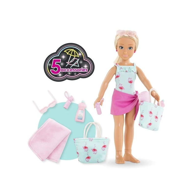 Elle porte un joli maillot de bain, un paréo assorti et une paire de boucles d’oreille amovibles. Valentine a un corps réaliste de jeune adolescente. Elle tient assise et debout toute seule.
