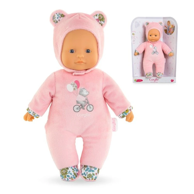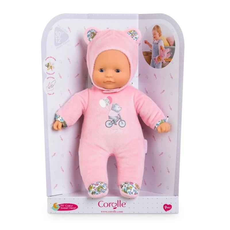Pti’ cœur Ours rose est un « doudou-poupon » de 30 cm dont la taille est parfaitement adaptée pour que votre tout-petit puisse l’attraper et le manipuler facilement.