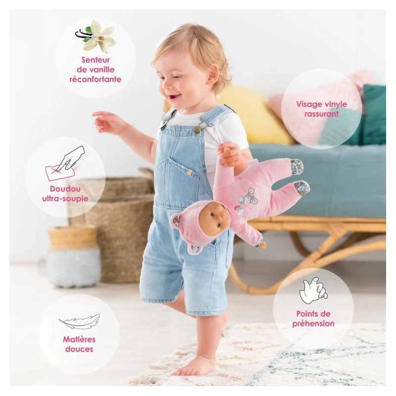 Son corps souple sans billes est léger et facile à saisir. Sa tête et ses mains, à la délicate senteur de vanille, sont en vinyle doux au toucher. Sa toile de corps est douce pour l’éveil des sens. Elle est non amovible.