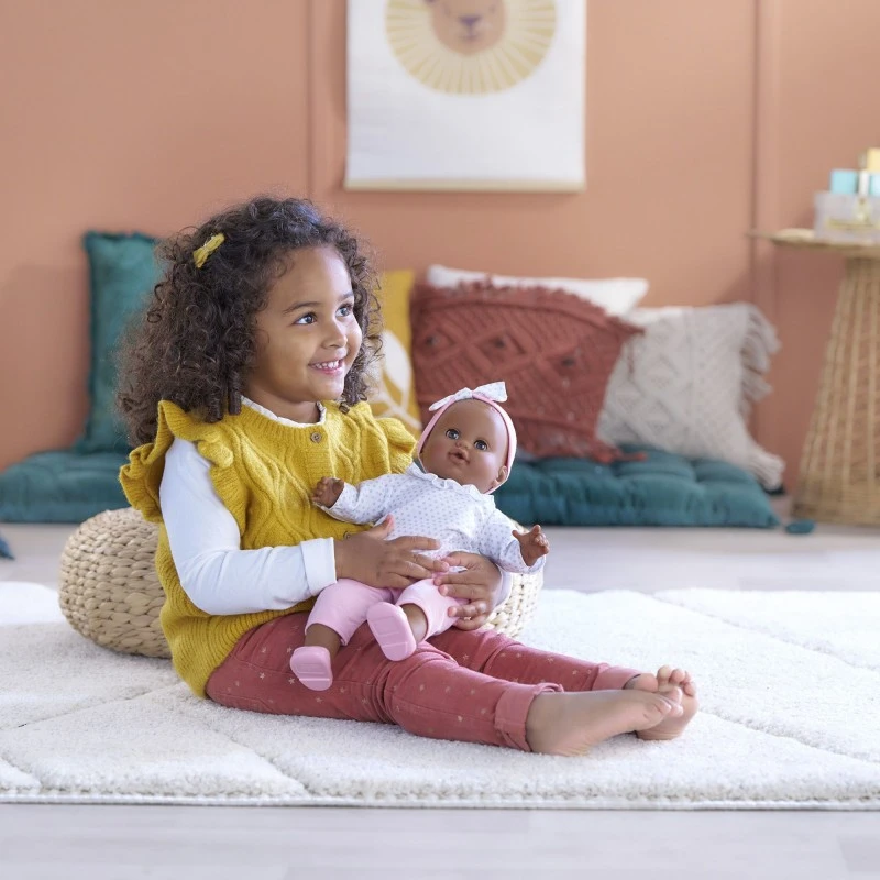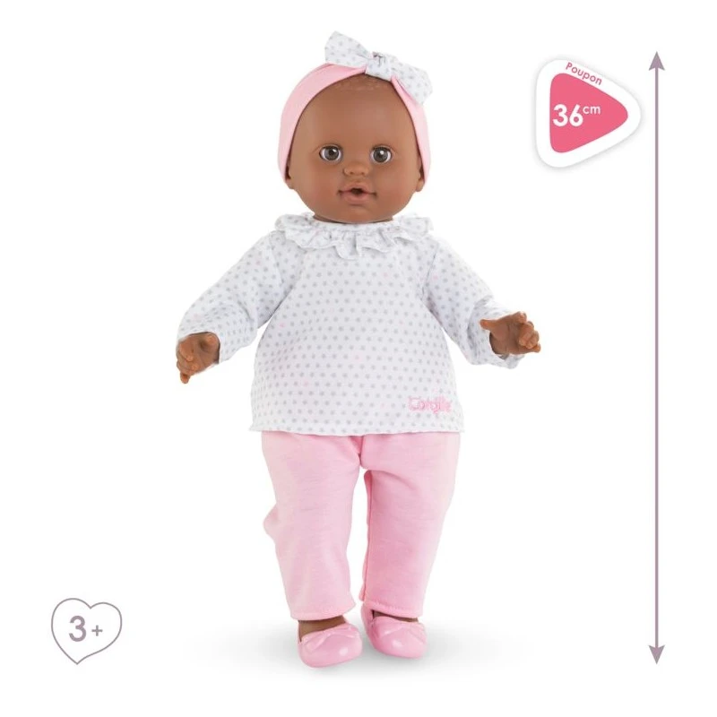 Elle mesure 36 cm, une taille parfaitement adaptée aux petits bras de l’enfant pour la câliner, la materner et reproduire les gestes qui font devenir grand.
