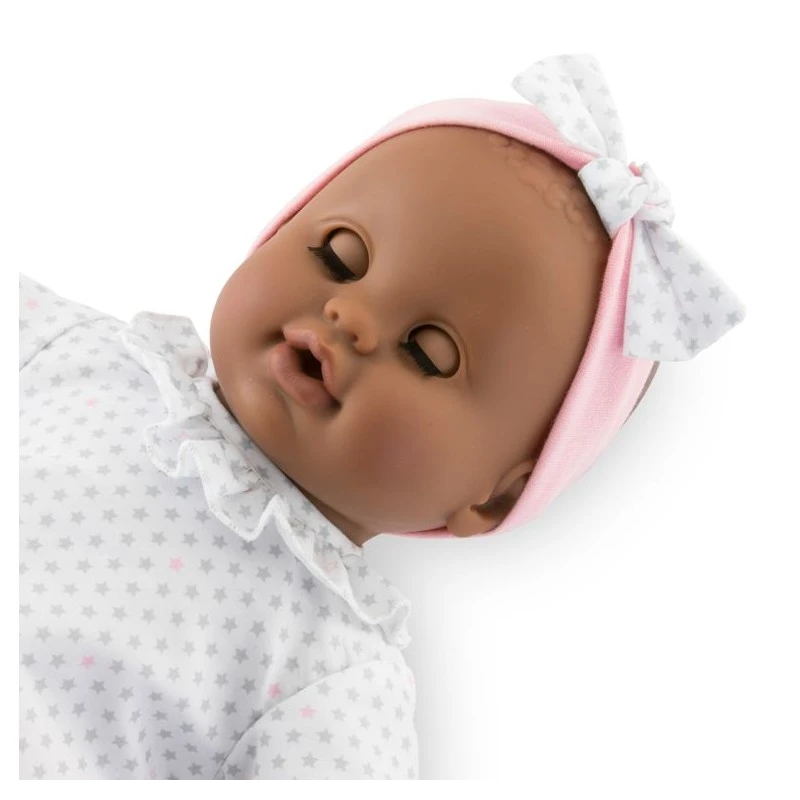Son visage, ses bras et ses jambes, à la délicate senteur de vanille, sont en vinyle doux au toucher. Son corps est souple pour faciliter ses mouvements et elle tient assise. Son pouce peut se maintenir dans sa bouche. Elle a la peau noire et les yeux marrons. Avec ses yeux dormeurs, elle fait dodo quand on la couche sur le dos.