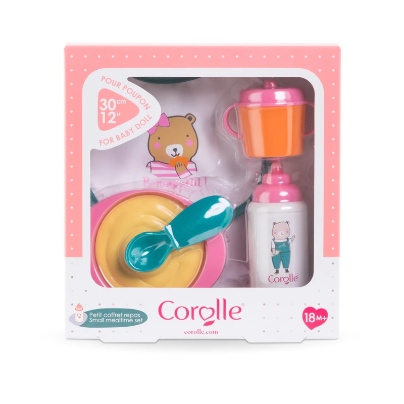 Dans ce coffret, vous trouverez les accessoires indispensables pour le repas des premiers poupons Corolle : un bavoir, un biberon, une cuillère, une assiette de purée et un gobelet de jus d’orange.