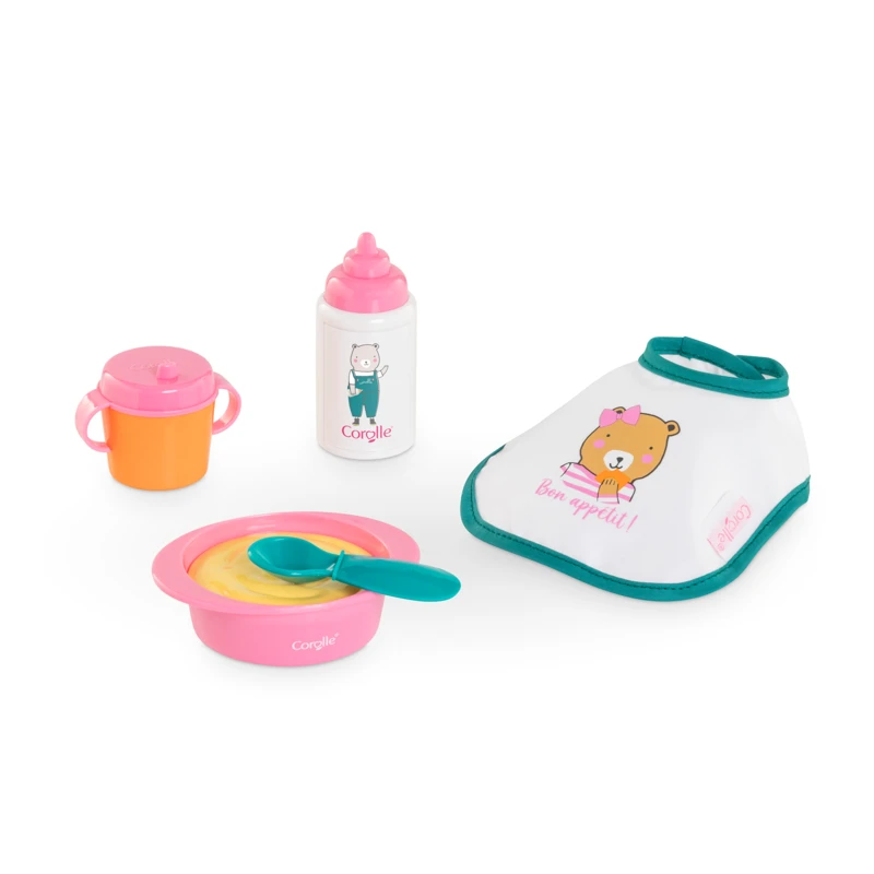 Contenu : 5 accessoires (bavoir, biberon, cuillère, assiette et gobelet)
