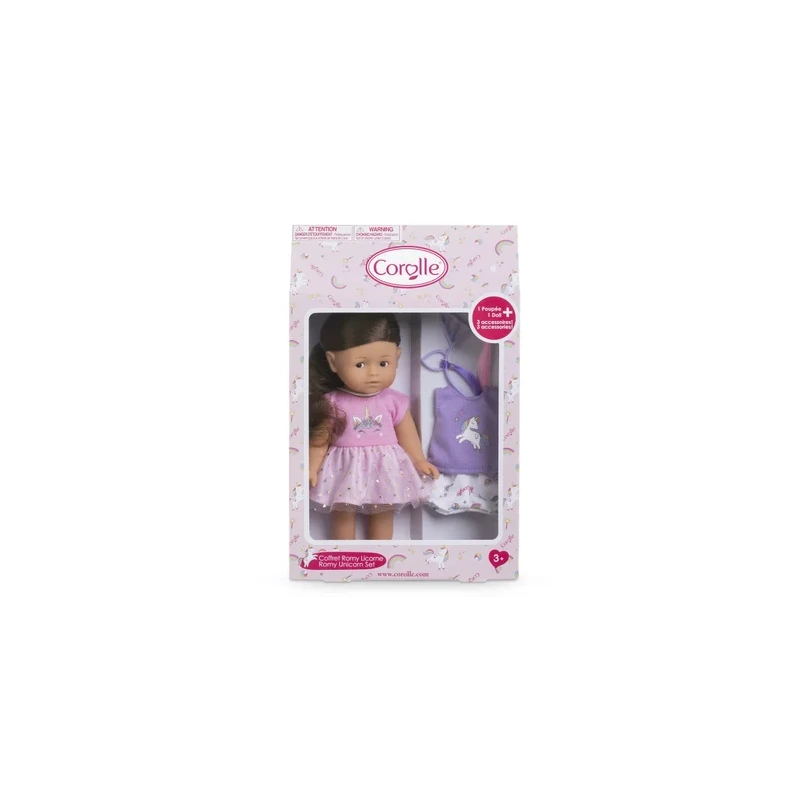 Coffret composé d’une petite poupée de 20cm prête à offrir et de 3 accessoires. Romy, une petite poupée à la peau claire, a un corps tout en vinyle doux au toucher et à la délicate senteur de vanille. Ses yeux marron sont peints sur son visage. Elle a des longs cheveux bruns et soyeux faciles à coiffer. Elle est habillée d’une robe en tulle couleur arc en ciel, d’une culotte et d’une paire de chaussures moulées assorties. Elle possède également 1 T-Shirt mauve, 1 Short blanc avec un imprimé licorne et 1 serre-tête licorne avec des extensions. Le Coffret Romy Licorne est vendu dans son emballage boîte cadeau, prêt à offrir ! C’est le cadeau idéal pour un goûter d’anniversaire, une surprise,… La poupée Romy se glisse facilement dans un sac