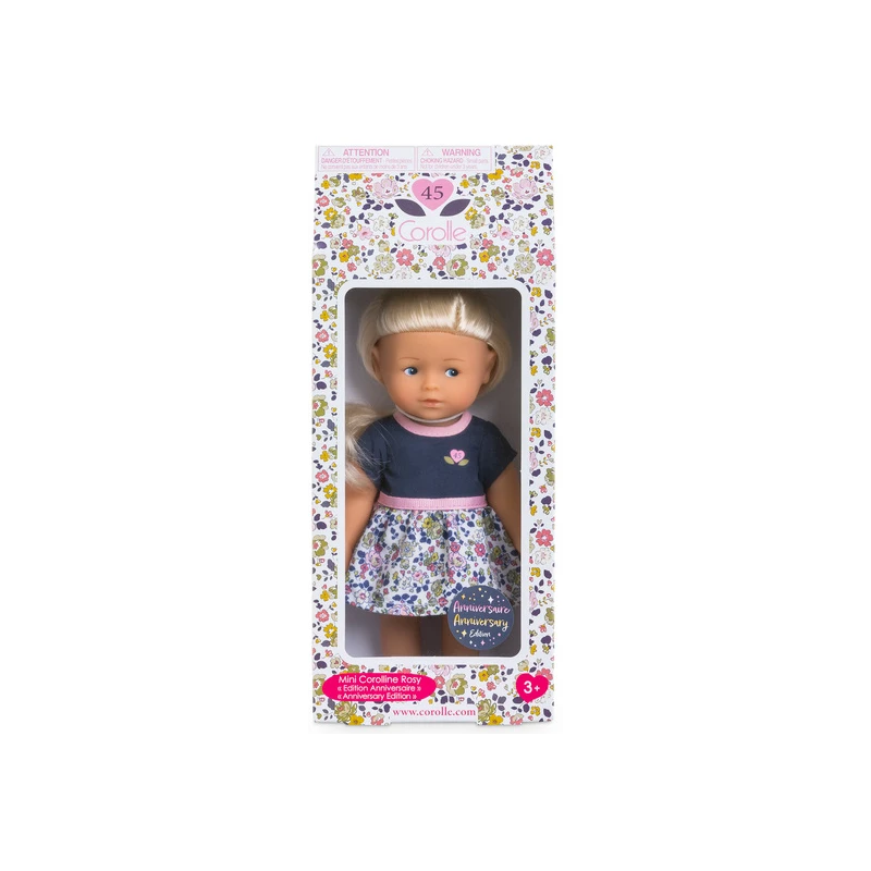 Mini Corolline Rosy Edition Anniversaire est une petite poupée de 20 cm collectoret prête à offrir. Petite poupée à la peau claire, elle a un corps tout en vinyle doux au toucher et à la délicate senteur de vanille. Ses yeux bleus sont peints sur son visage. Elle a des longs cheveux blonds et soyeux pour faciliter le coiffage. À l’occasion de ses 45 ans, Corolle a voulu proposer une petite poupée habillée d?une jolie robe fleurie, d?une culotte et d?une paire de chaussures moulées assorties. Mini Corolline Rosy Edition Anniversaire est le cadeau idéal pour un goûter d’anniversaire, une surprise, … Cette petite poupée nomade se glisse facilement dans un sac ou dans un cartable pour accompagner votre enfant tout au long de la journée. Chaqu