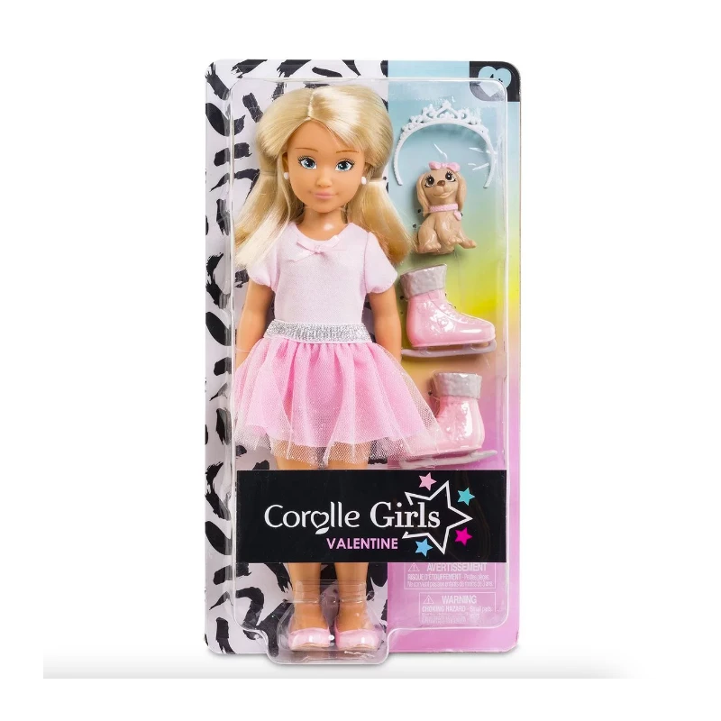 Le coffret Valentine Ballerine est composé de Valentine, une poupée mannequin de 28 cm, et de 7 accessoires. Valentine a un joli visage naturel aux traits fins qui sent bon la vanille. Ses yeux sont peints et elle possède de longs cheveux blonds coiffés d?une tiare. Elle porte une paire de boucles d?oreilles amovibles, un justaucorps, un tutu et une paire de ballerines amovibles pour s?adonner à sa passion : la danse classique. Valentine, c?est la sportive de la bande des Corolle Girls ! Elle pratique également le patinage et possède donc une paire de patins à glace amovibles. Elle a un corps réaliste de jeune adolescente, tient assise et debout toute seule. Elle est accompagnée de son chien Tutu qui la suit partout. Les Corolle Girls sont
