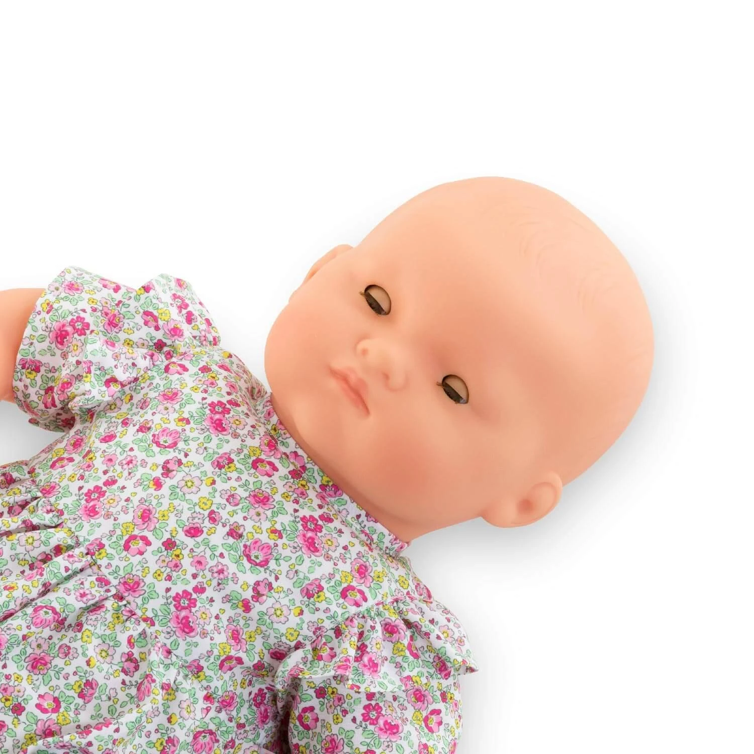 Il est grand comme un nouveau-né avec ses 52 cm ! Bébé Chéri Jardin en Fleurs est habillé d’une barboteuse fleurie avec des volants sur les épaules.