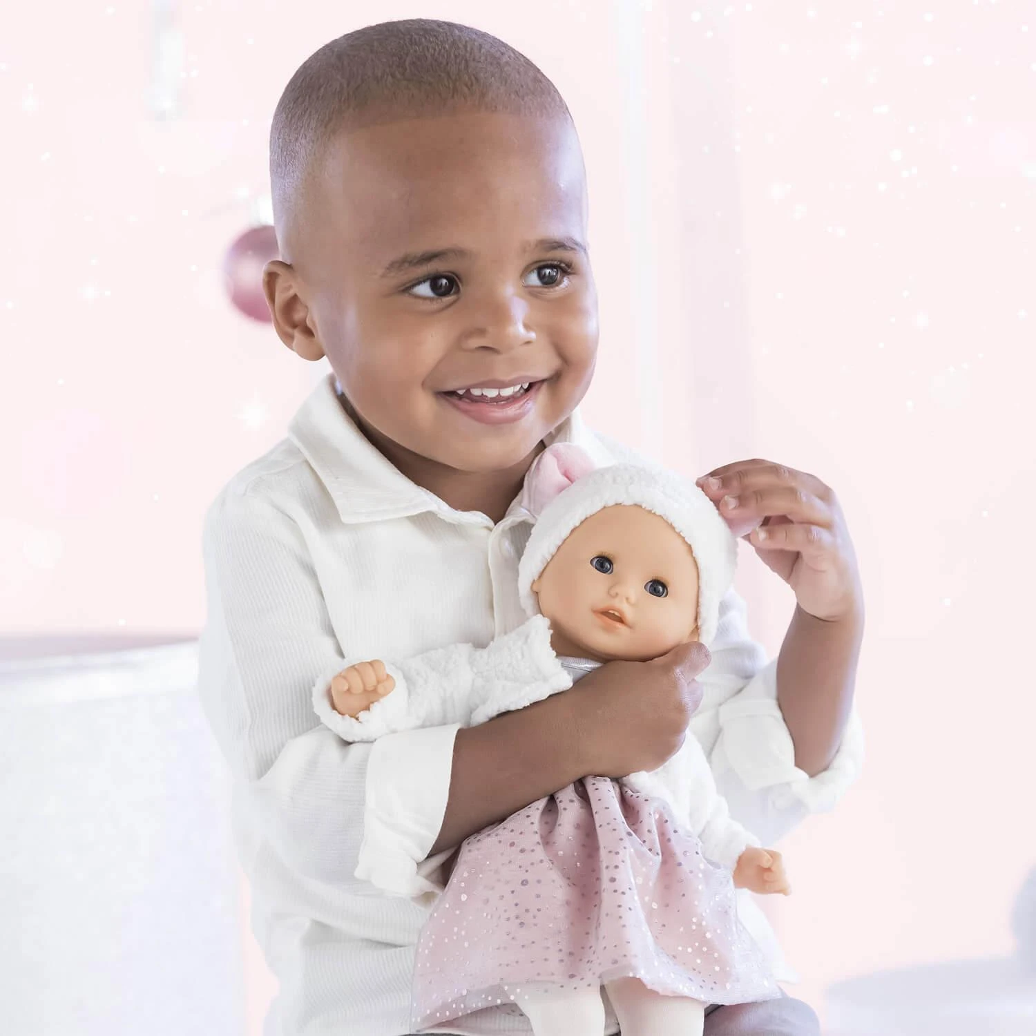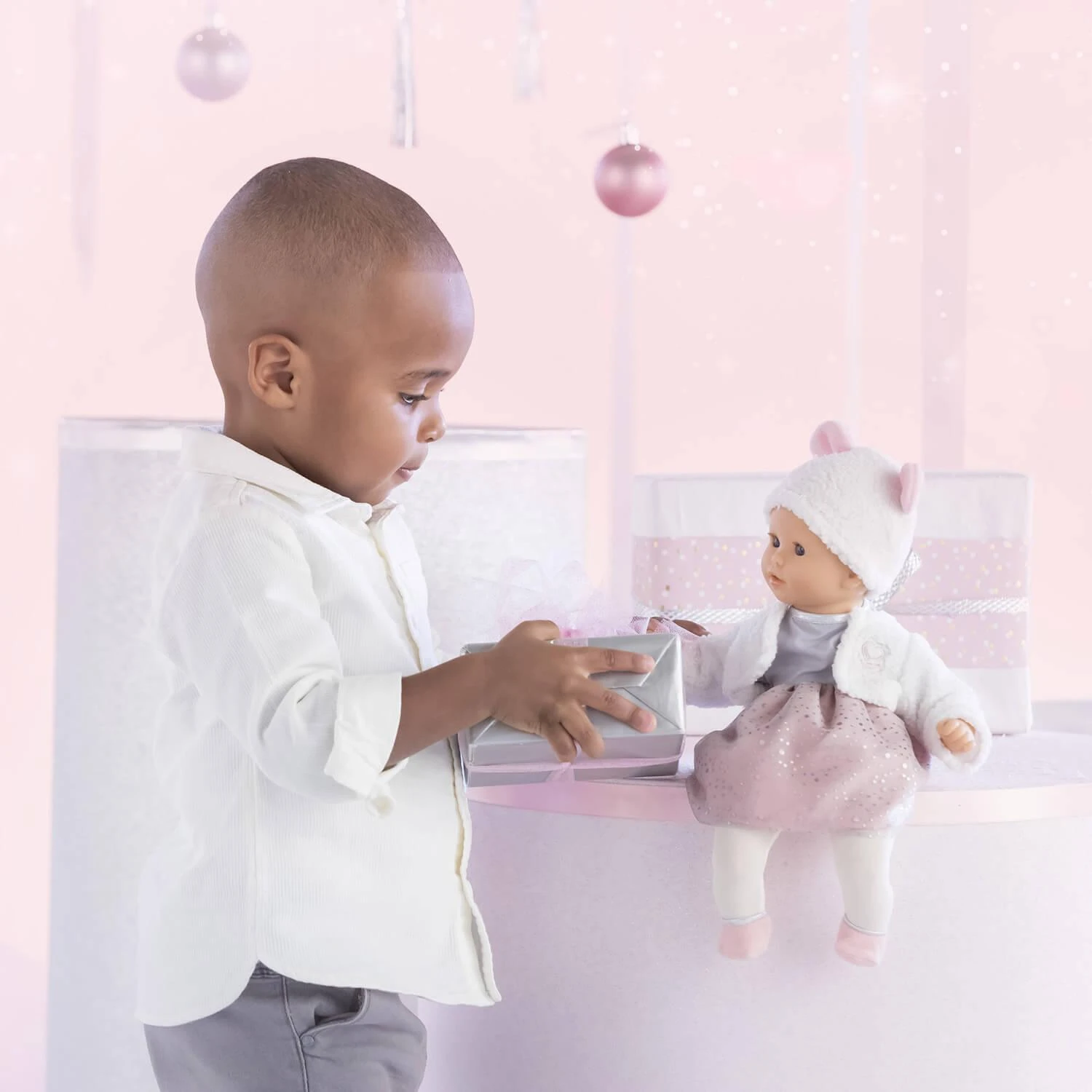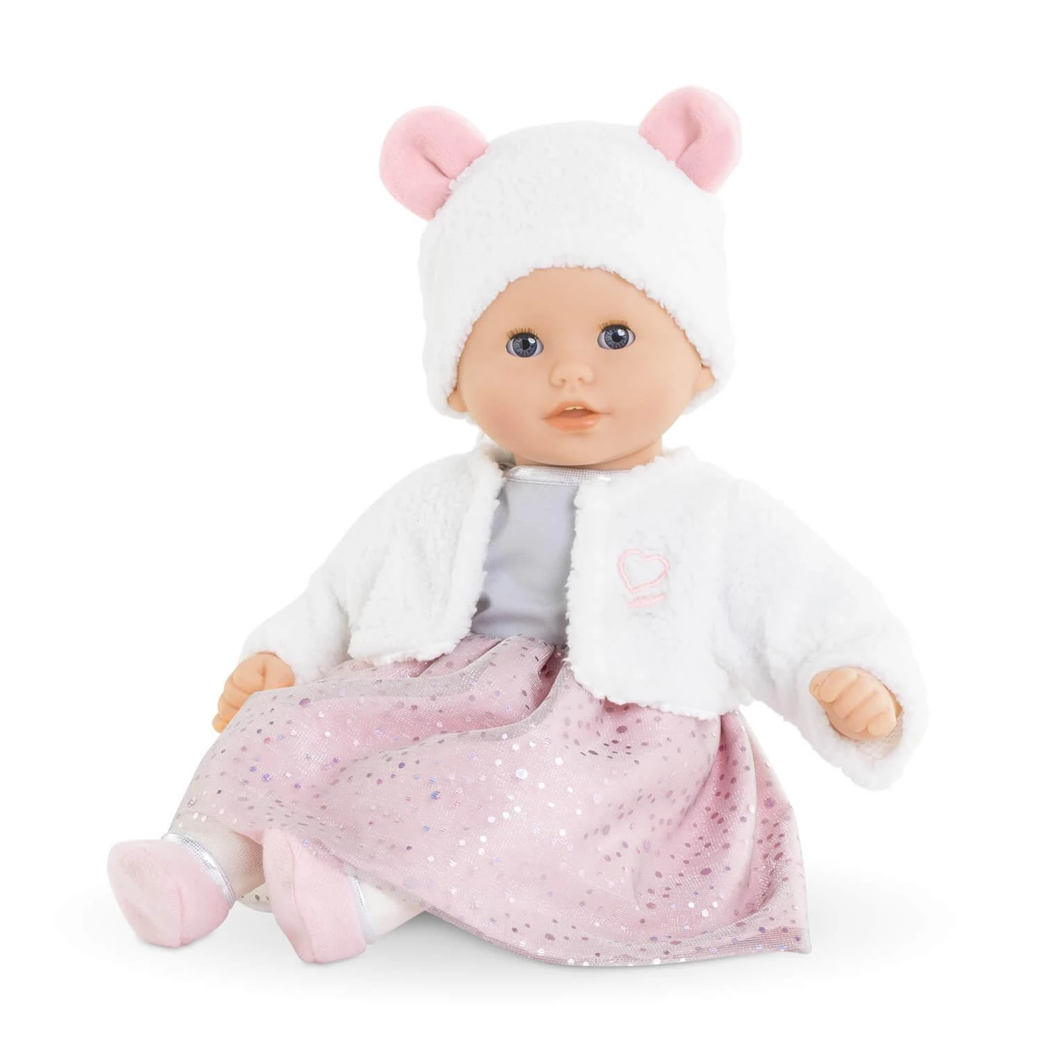 Bébé Calin Marguerite Soir de Fête est un petit poupon de la marque Corolle mesurant 30 cm, la taille parfaitement adaptée aux petits bras et mains de l’enfant pour le manipuler.