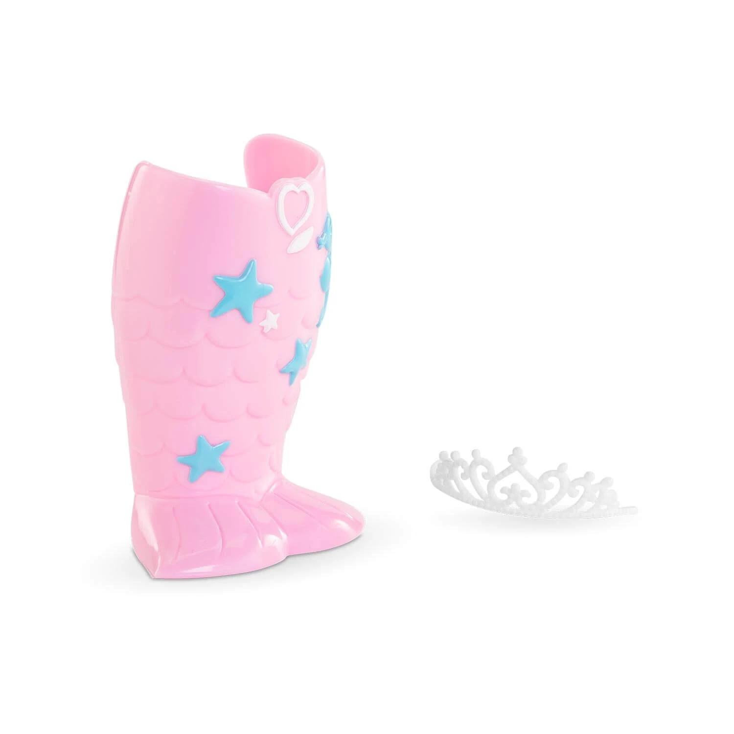 Elle est habillée d’un maillot de bain deux pièces scintillant et est coiffée d’un diadème. Pour la transformer en sirène : rien de plus simple ! Il suffit de clipser sa demi-queue sur ses jambes.